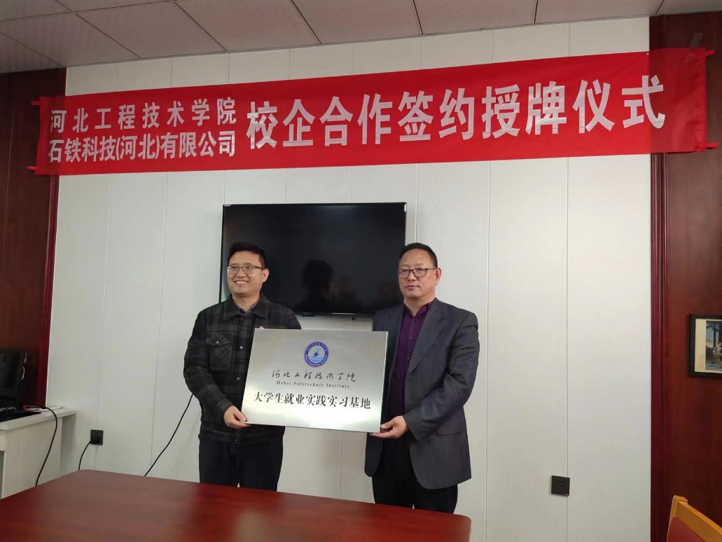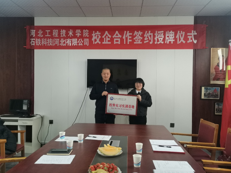 石铁科技(河北)有限公司总经理刘立峰致辞,代表公司董事长,总经理对河北省工程技术学院土木工程学院各位领导的到来表示热烈的欢迎!会上,双方共同探讨人才培养方案、学生实习实践、就业、教师挂职锻炼等具体合作事宜,就校企合作事宜进行了深度交流。并签订校企合作协议,同时,授予了石铁科技(河北)有限公司,“河北工程技术学院大学生就业实践实习基地”和“河北工程技术学院校外实习实训基地”。