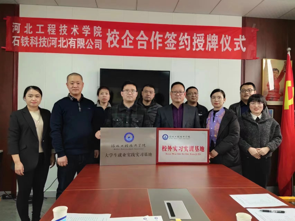 2月24日下午,在石铁科技(河北)有限公司隆重举行了河北工程技术学院校企合作签约授牌仪式。河北省工程技术学院土木工程学院对外合作部部长王俊昆,土木工程学院副院长李伟娜,土木工程学院实践中心主任栗莎,土木工程学院教师王雪出席,石铁科技领导班子和骨干成员参加了仪式。